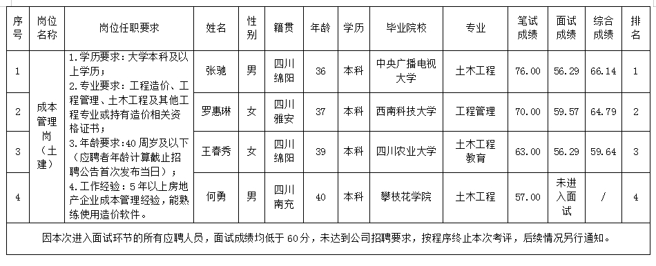 根據(jù)綿陽市綿投置地有限公司發(fā)布的招聘公告及招聘相關規(guī)定,經(jīng)筆試、面試等程序,現(xiàn)將筆試、面試成績予以公示。