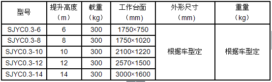 產(chǎn)品規(guī)格:車載式液壓升降平臺根據(jù)升降高度可分為:68、10、1214升降平臺,設(shè)備載重300公斤至500公斤??蛻艨筛鶕?jù)需求選用解放、東風(fēng)、輕騎、福田、電瓶車等任何車型,設(shè)備直接采用汽車或電瓶的直接動力升降。